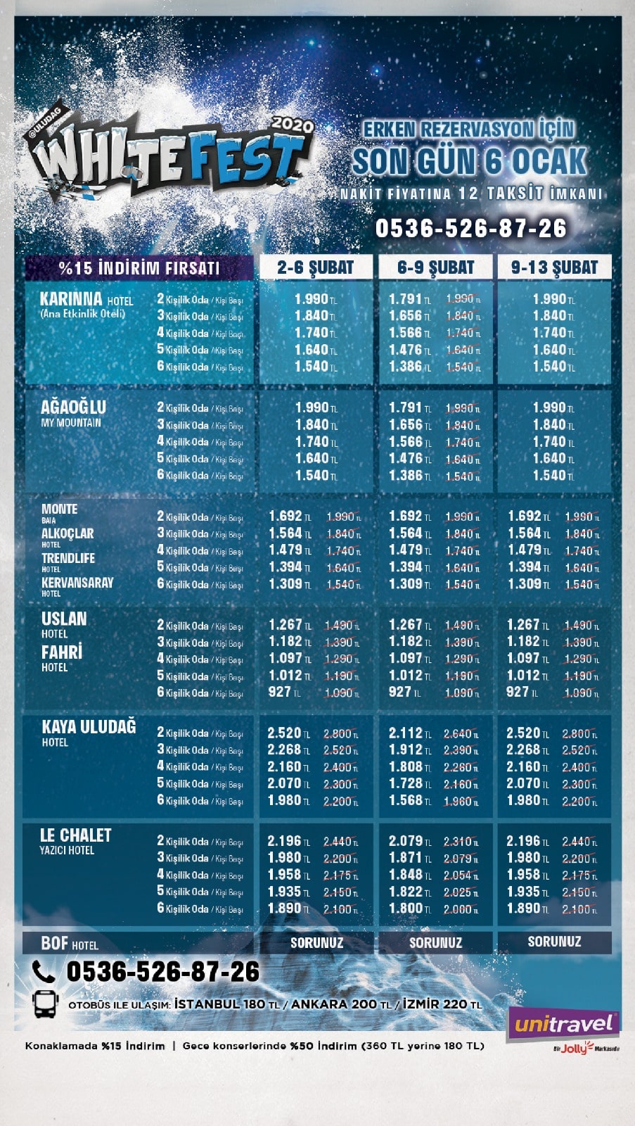 Whitefest 2021 tarihleri 2-6 Şubat (4 gece 5 gün) 6-9 Şubat (3 gece 4 gün) Şubat